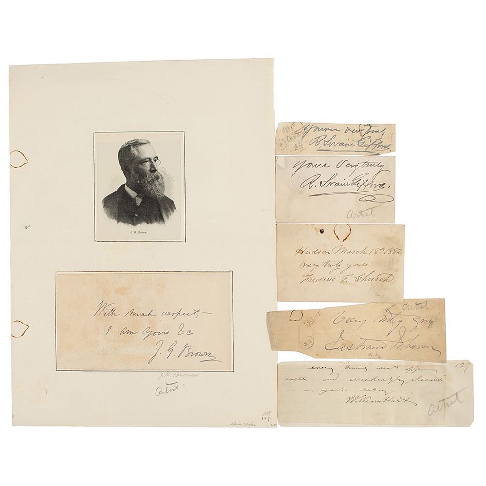 Six clipped signatures of notable American painters, including: Hudson River School landscape artist Frederic Edwin Church; Hudson River School landscape and cattle painter William Hart; landscape painter Robert Swain Gifford (2); genre painter, portraitist, and Metropolitan Museum of Art co-founder Eastman Johnson; and genre painter John George Brown. In overall very good to fine condition, with scattered soiling and rusty circular paperclip impressions to three slips.