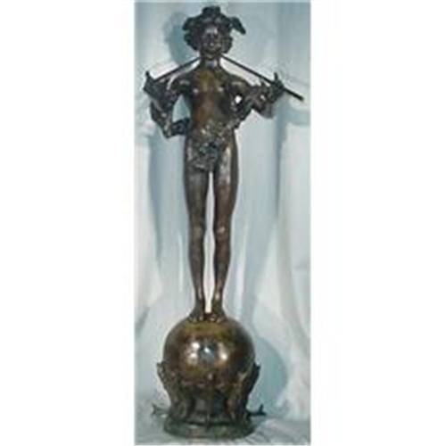 Cast after a model by Frederick MacMonnies, circa 1900, Shown with arms outstretched and holding two flutes to his mouth, standing on an orb supported on a circle of upright fish, raised on a circular base, medium brown patina. This piece is inscribed Frederick MacMonnies, Copyright 1894, Paris 1890, TO PAN OF ROHALLION A NO DOMINI M.D.C.C.C.L.X.L., ROMAN BRONZE WORKES NY, 'SOME REPAIRS TO FLUTE'