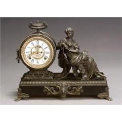 American Patinated Metal and Faux Slate Figural Mantel Clock