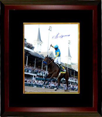 American Pharoah won the American Triple Crown in 2015. He is bred and owned by Ahmed Zayat of Zayat Stables, LLC, trained by Bob Baffert and ridden in most of his races by Victor Espinoza. He is the first American Triple Crown winner since Affirmed in 1978 and only the twelfth in history. American Pharoah won the 2015 Kentucky Derby and 2015 Preakness Stakes. He won the Triple Crown in a wire-to-wire victory at the Belmont Stakes with his time the second-fastest for a Triple Crown winner and his closing quarter-mile time of 24.32 was actually faster than Secretariat\'s.Victor Espinoza has hand signed this 8X10 Photo on American Pharoah from the Kentucky Derby. Steiner Sports Hologram and Certificate of Authenticity. Custom Black Mat and Premium Mahogany Frame as shown.
