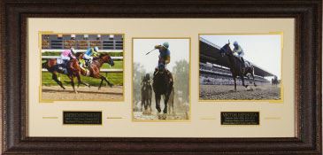 American Pharoah won the American Triple Crown in 2015. He is bred and owned by Ahmed Zayat of Zayat Stables, LLC, trained by Bob Baffert and ridden in most of his races by Victor Espinoza. He is the first American Triple Crown winner since Affirmed in 1978 and only the twelfth in history. American Pharoah won the 2015 Kentucky Derby and 2015 Preakness Stakes. He won the Triple Crown in a wire-to-wire victory at the Belmont Stakes with his time the second-fastest for a Triple Crown winner and his closing quarter-mile time of 24.32 was actually faster than Secretariat's.This is three original 8x10 photos of American Pharoah with premium leather framing as shown to an over-all size of approx 41"x19".