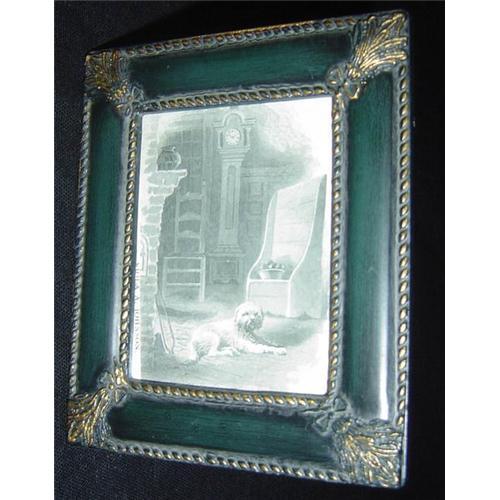 Green Leather and Painted Picture Frame Circa. 1940. Combination of leather, gold paint and expert craftsmanship created this frame from the 1940's.