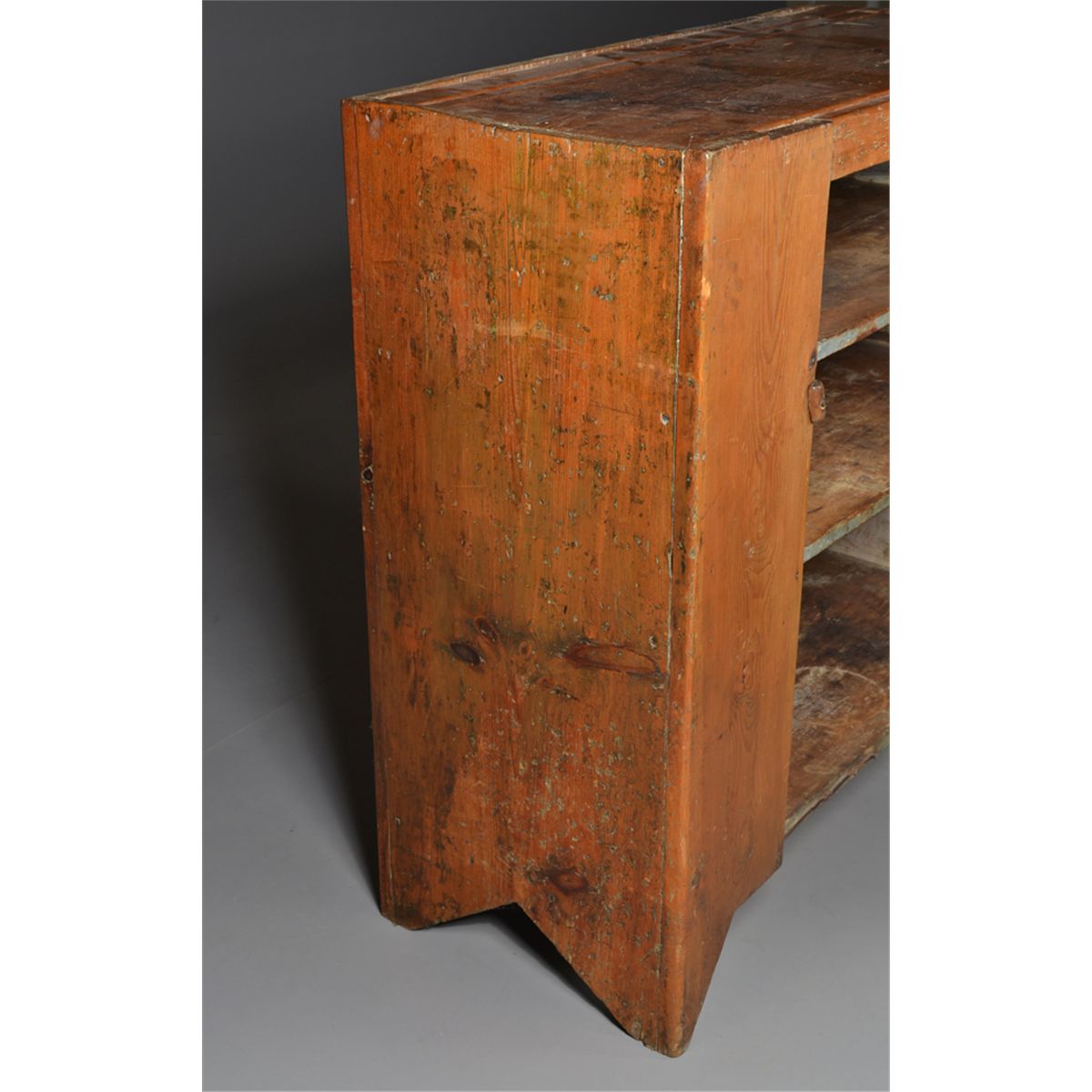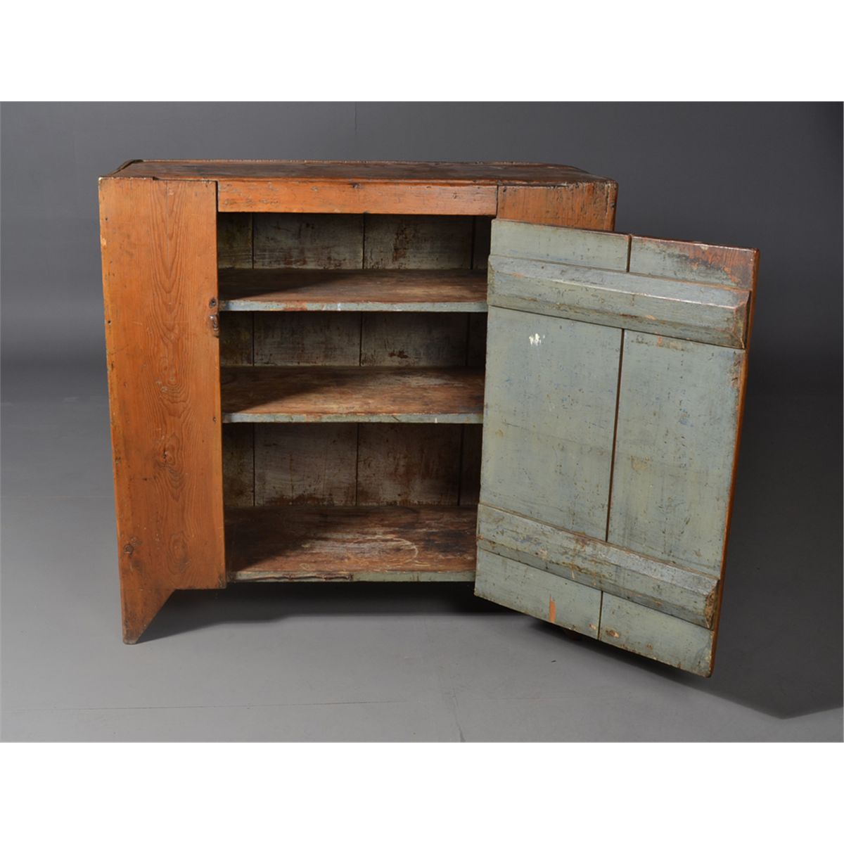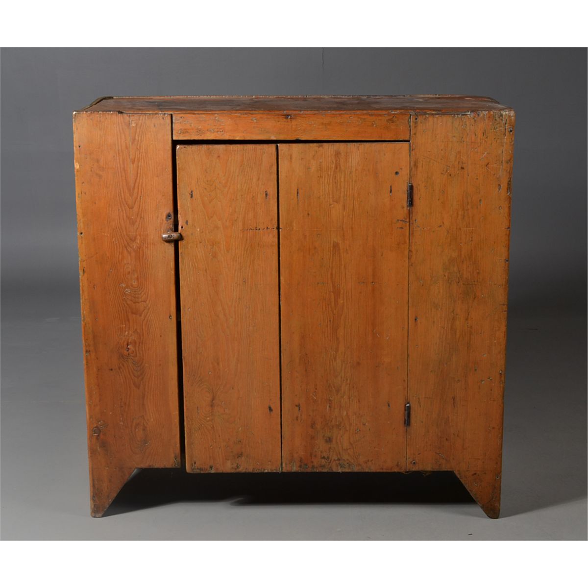 With one door opening to a shelved interior, with boot jack feet, retaining an old if not original varnished surface. 41.5" H x 42.75" L x 18.75" D. Circa 19th century. Private collection Gregory, MI.