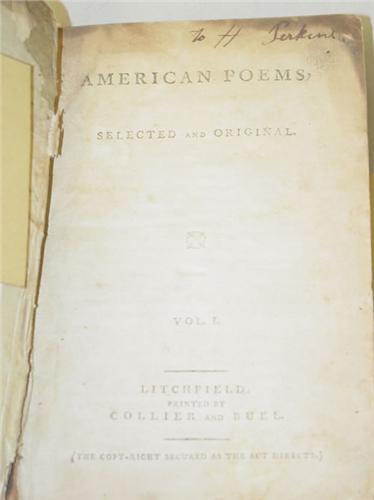 American Poems, Selected and Original - Volume I. Litchfield: Collier and Buel, 1793. First Edition. 12mo - over 6¾" - 7¾" tall. Hard Cover. Ex-Library. Fair Condition. SCARCE - FIRST ANTHOLOGY OF AMERICAN POETRY. viii, 304pp, 6 List of Subscibers and 1 Errata, bound in leather. No library markings on pages. Covers detached, lacks ffp & half of back free end paper, owners signature on title page, lacks upper backstrip, occasional foxing. Poetry by Trumbull, Dwight, Barlow, Humphreys and others.
