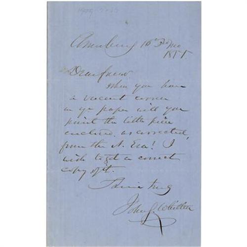<B>American Poet John Greenleaf Whittier Autograph Letter Signed</B></I> "<I>John G. Whittier</B></I>". One page, 5" x 7.75", Amesbury, Massachusetts, 1855, with the usual fold creases, else a fine example. Whittier writes to an unknown newspaper editor in regards to submitting his poem "Flowers in Winter". The letter reads in part: "<I>Dear Friend When you have a vacant corner in your paper will you print the little piece enclosed as corrected, from the N. Era! I wish to get a correct copy</B></I>." The letter is sold with the poem mentioned by Whittier in his letter. The poem had been previously published in the <I>National Era</B></I>, a Washington D.C. newspaper apparently with mistakes. Whittier has hand-corrected two lines of the poem. The paper on which the poem was printed has toned slightly else it is in very good condition. A nice offering from a poet once as famous as Longfellow.<BR><BR><BR><b>Shipping:</b> Flat Material, Small (<a target="_blank" href="http://www.heritageauctions.com/common/shipping.php">view shipping information</a>)