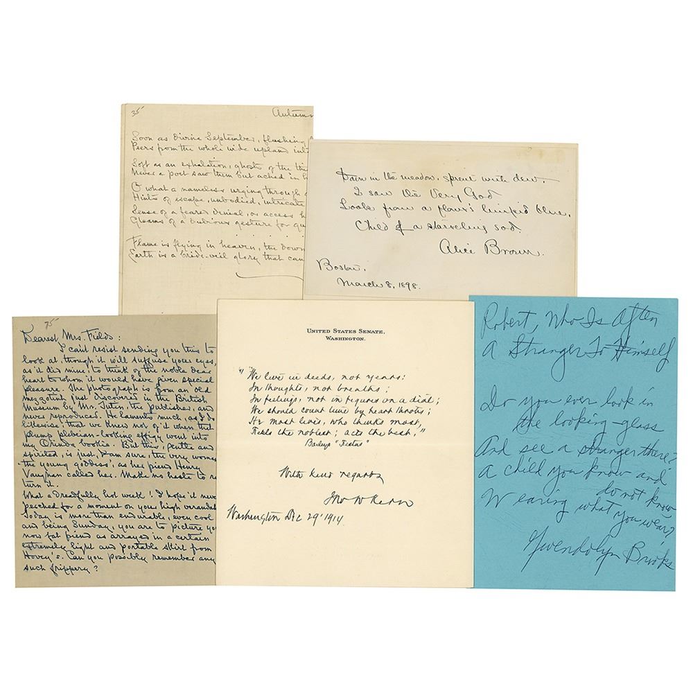 Five American poetical autographs, including: Gwendolyn Brooks (AQS), Louise Imogen Guiney (ALS and AQS), Alice Brown (AQS), and John W. Kern (AQS). In overall fine condition.