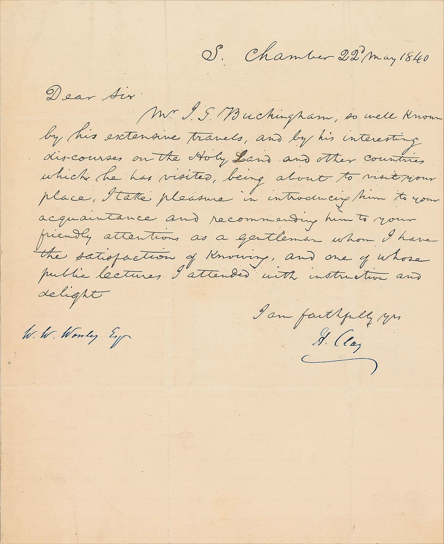 LS signed “H. Clay,” one page, 8 x 10, May 22, 1840. Letter to W. W. Wonley, written from the Senate Chamber to introduce the journalist and traveler James Silk Buckingham. In full: "Mr. J. S. Buckingham, so well known by his travels, and by his interesting discourses on the Holy Land and other countries which he has visited, being about to visit your place, I take pleasure in introducing him to your acquaintance and recommending him to your friendly attention as a gentleman whom I have the satisfaction of knowing, and one of whose public lectures I attended with instruction and delight." In fine condition, with old mounting remnants along the edge of the integral address leaf.
