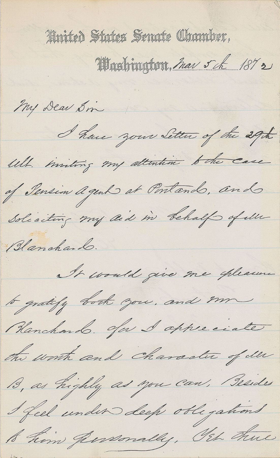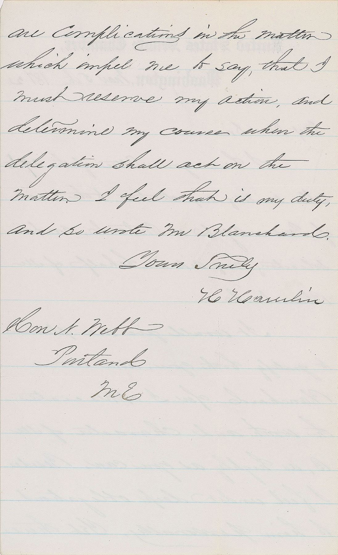 ALS signed “H. Hamlin,” one page both sides, 5 x 8, United States Senate Chamber letterhead, March 5, 1872. Letter to "Hon. N. Webb, Portland, ME," concerning "the case of Pension Agent at Portland," in part: "It would give me pleasure to gratify both you, and Mr. Blanchard, for I appreciate the worth and character of Mr. B….Yet there are complications in the matter which impel me to say, that I must reserve my action, and determine my course when the delegation shall act on the matter." In fine condition.