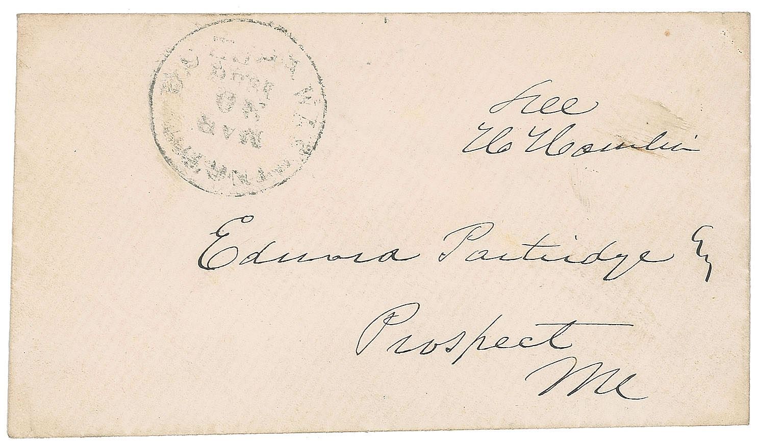 Free-franked mailing envelope, addressed by Hamlin to "Edward Partridge, Prospect, Me," and franked in the upper right, "Free, H. Hamlin." In fine condition.