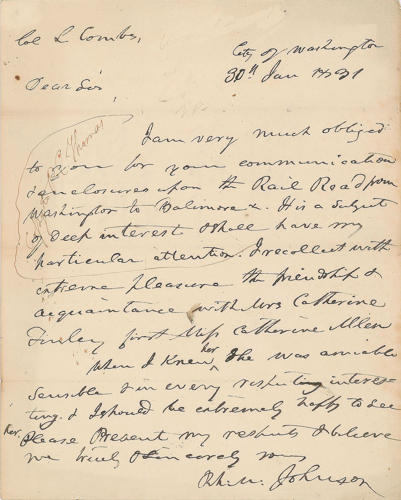 ALS signed “Rd: M: Johnson,” one page, 8 x 9.75, January 30, 1831. Letter to Colonel Leslie Combs, in part: "I am very much obliged to you for your communication & enclosures upon the Rail Road from Washington to Baltimore. It is a subject of deep interest & shall have my particular attention. I recollect with extreme pleasure the friendship & acquaintance with Mrs. Catherine Finley first Miss Catherine Allen. When I knew her, she was amiable, sensible & in every respect interesting, & I should be extremely happy to see her." In fine condition, with a contemporary ink notation to the body of the text.
