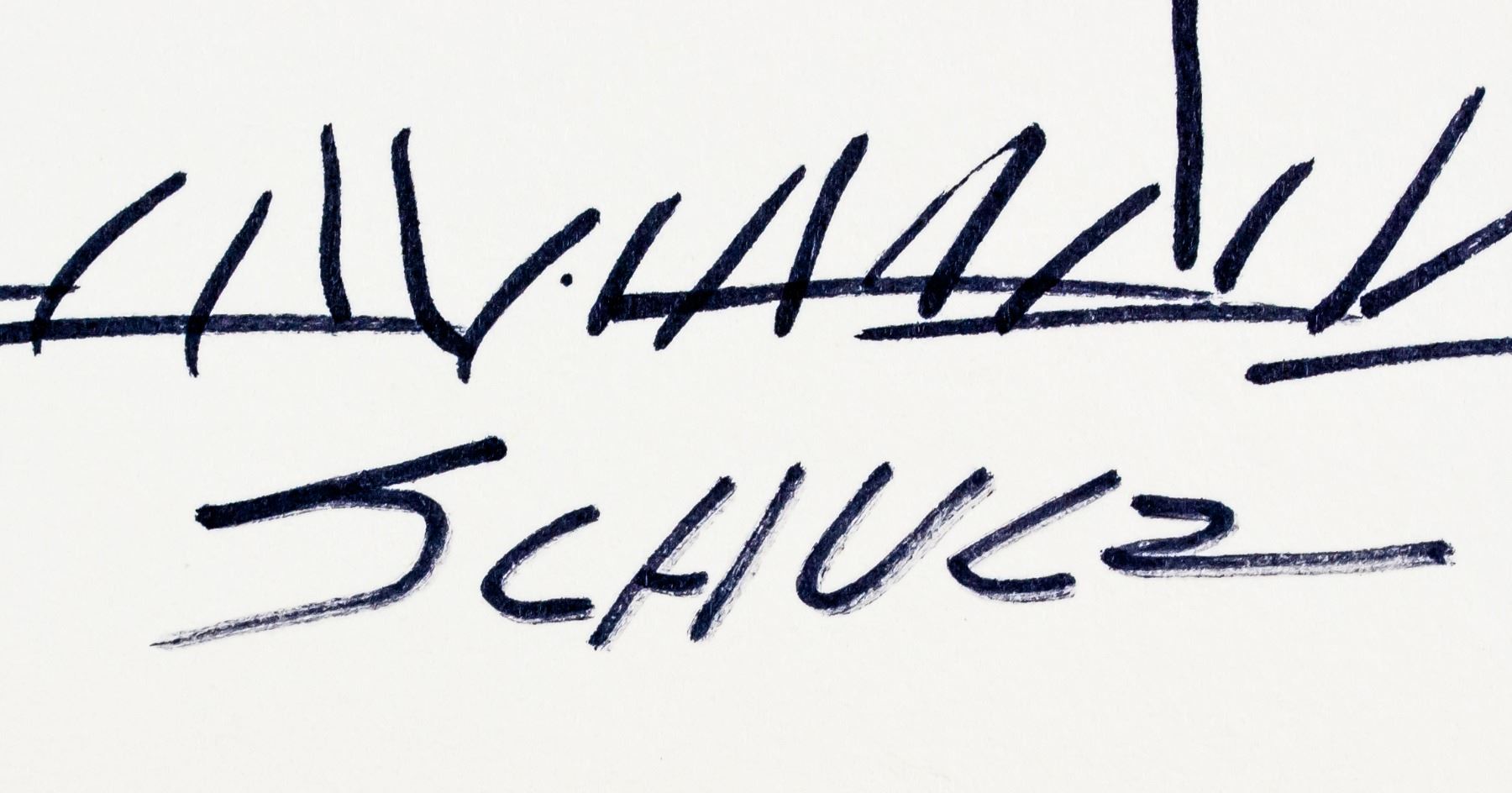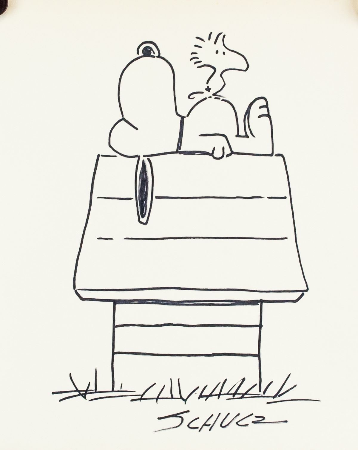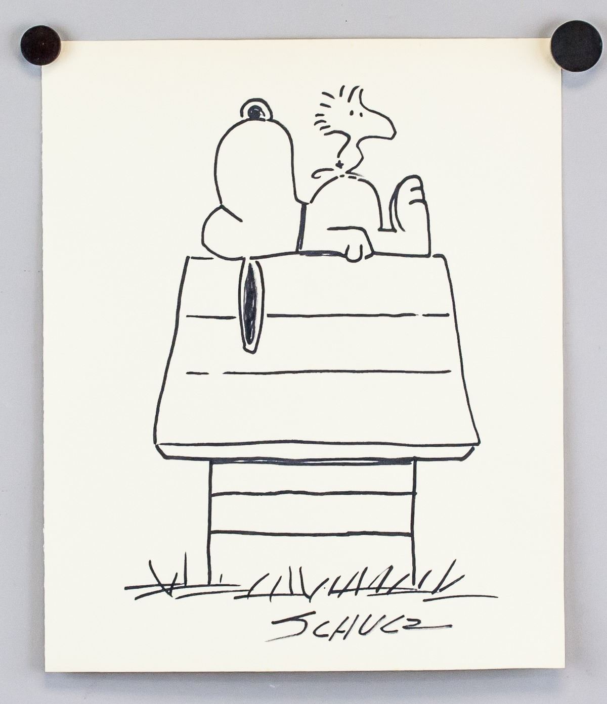Marker on paper. Featuring Snoopy above doghouse. Signed illegibly on the lower right corner. 30 x 24.5 cm (11.75 x 9.75 in). PROVENANCE: This lot carries limited provenance from an Upper New York estate