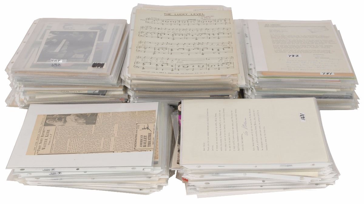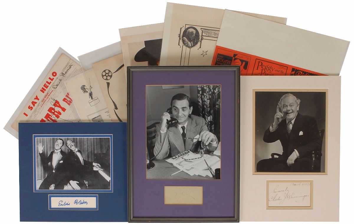 Remarkable collection of nearly 500 items signed by a wide assortment of composers, lyricists, singers, performers, and others related to the canon of American Popular Song, consisting mostly of letters, documents, and signed photos. Signers include: Duke Ellington; Irving Berlin (4); William C. Handy (3); George M. Cohan (8); Samuel Goldwyn; Ira Gershwin (4); Johnny Green (2); Mary Martin (4); Fred Astaire; Johnny Marks; Eubie Blake (5); Meredith Willson (12); Irving Caesar (13); Fanny Brice (3); Alan Jay Lerner (2); Sammy Cahn (10); Leonard Bernstein (2); Rudolf Friml (6); Eddy Duchin; Ray Bolger; Vera-Ellen (5); Henry Mancini (5); Perry Como (2); Hoagy Carmichael (11); J. Fred Coots (5); Johnny Mercer (2); Johnny Green (7); Jack Norworth (2); Geoffrey O’Hara (15); James Van Heusen (11); Jule Styne; Burt Bacharach; Victor Herbert; Judy Holliday; Edna Ferber; DuBose Heyward; Sigmund Romberg (2); Sammy Cahn and Milton Berle; Eddie Cantor; Andre Previn; Otto Harbach (2); Otto Harbach and Irving Caesar, and many others. Includes many unsigned items and numerous original mailing envelopes. In overall very good to fine condition. An unprecedented assortment of America’s most storied and influential musicians.