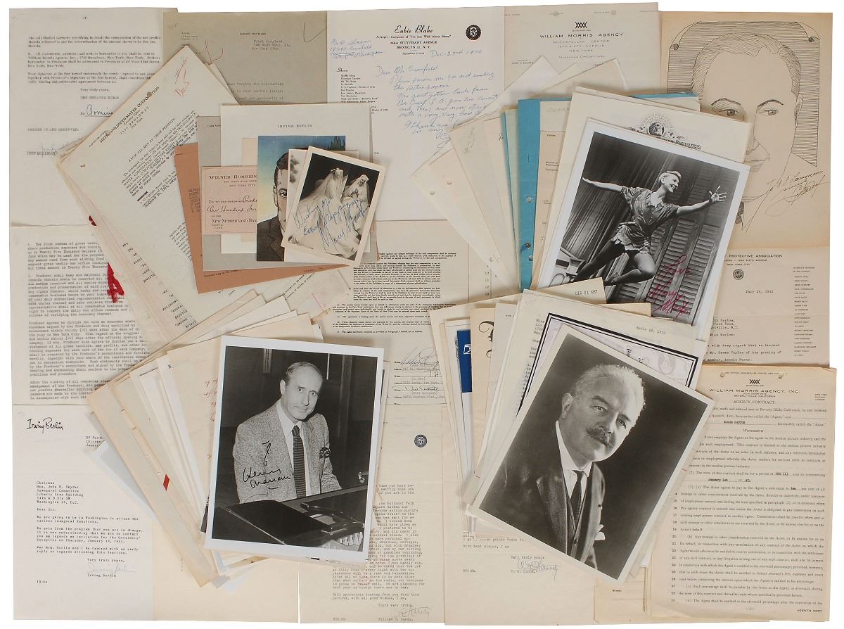 Remarkable collection of nearly 500 items signed by a wide assortment of composers, lyricists, singers, performers, and others related to the canon of American Popular Song, consisting mostly of letters, documents, and signed photos. Signers include: Duke Ellington; Irving Berlin (4); William C. Handy (3); George M. Cohan (8); Samuel Goldwyn; Ira Gershwin (4); Johnny Green (2); Mary Martin (4); Fred Astaire; Johnny Marks; Eubie Blake (5); Meredith Willson (12); Irving Caesar (13); Fanny Brice (3); Alan Jay Lerner (2); Sammy Cahn (10); Leonard Bernstein (2); Rudolf Friml (6); Eddy Duchin; Ray Bolger; Vera-Ellen (5); Henry Mancini (5); Perry Como (2); Hoagy Carmichael (11); J. Fred Coots (5); Johnny Mercer (2); Johnny Green (7); Jack Norworth (2); Geoffrey O’Hara (15); James Van Heusen (11); Jule Styne; Burt Bacharach; Victor Herbert; Judy Holliday; Edna Ferber; DuBose Heyward; Sigmund Romberg (2); Sammy Cahn and Milton Berle; Eddie Cantor; Andre Previn; Otto Harbach (2); Otto Harbach and Irving Caesar, and many others. Includes many unsigned items and numerous original mailing envelopes. In overall very good to fine condition. An unprecedented assortment of America’s most storied and influential musicians.