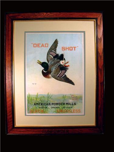 American Powder Mills Dead Shot Poster, no bands. Depicting a falling duck. The word Gunpowder embossed at bottom of frame. Framed and matted. Excellent original condition. 14 X 20 inches.