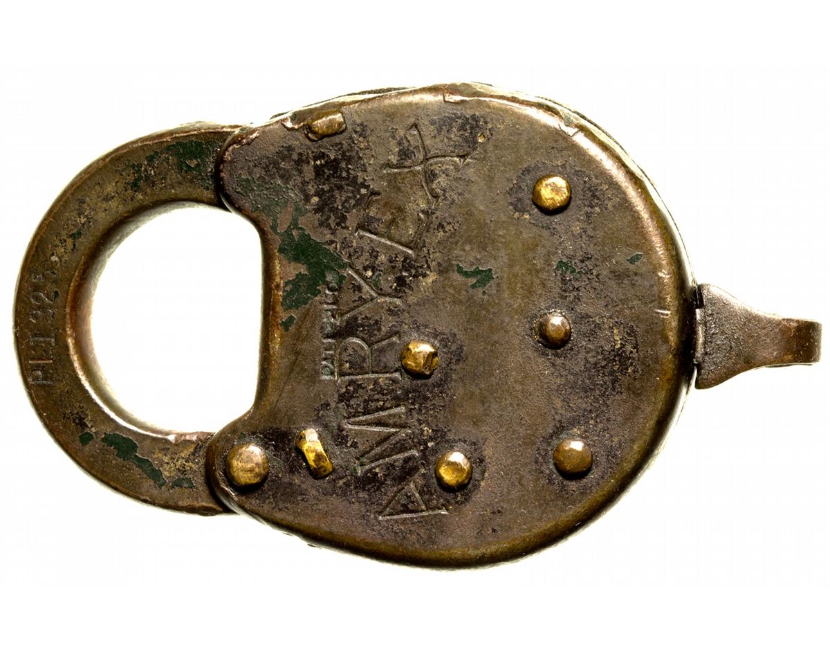 The American Railway Express, according to Encyclopedia Britannica, was established by the U.S. Government in 1918, during WWI when the government took over the nation’s railroads, and operated under that name until 1929. In 1929, the company absorbed several other agencies and became Railway Express Agency, Inc. No information on the patent marking was readily available. This lock likely dates between 1918 and 1929. Riveted padlock marked “AM.RY.EX.” on front shackle and “PL1325” on rear shackle. Unmarked key drop on front. Rear marked “Pat. 1-21-0” above “AM.RY.EX.” Chain fob intact, but missing chain. - Jacobitz Collection -59557