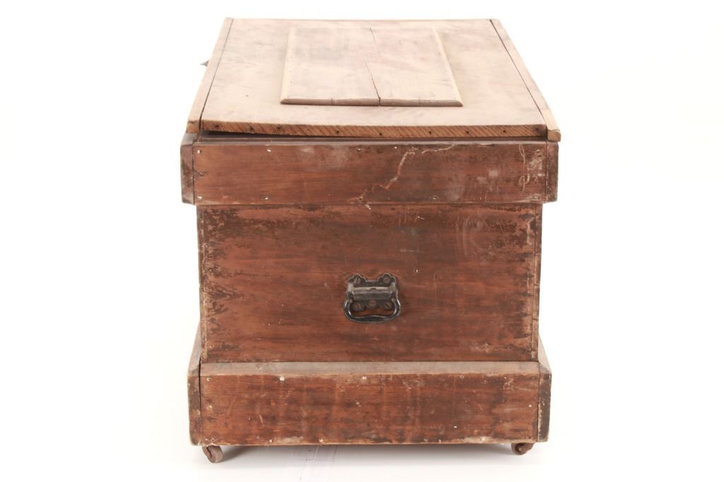 Featured in this lot is this American raised panel dowry chest circa 1890 - 1910. The chest is wonderfully and professionally crafted with softwood construction and features hinges shown on the back of the chest. The chest features a brass lock on the front of the chest and a little brass handle that reads: UB - M.E.C. Co. - Michigan. The chest is set on small metal casters and includes cast iron handles on both sides of the chest. The condition of this of this chest is good with some missing trim on the right side of the lid but otherwise is in good overall condition. The measurements of this chest are 41 1/2" x 24 1/4" x 24 1/2".