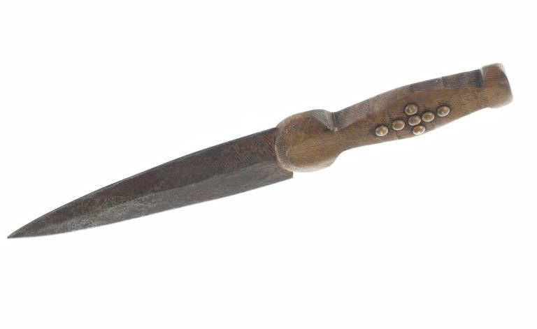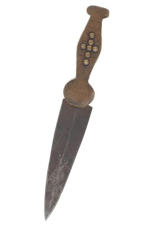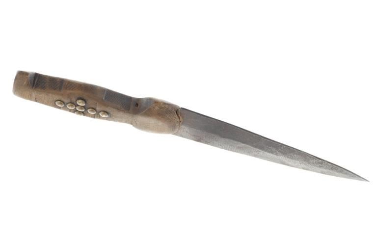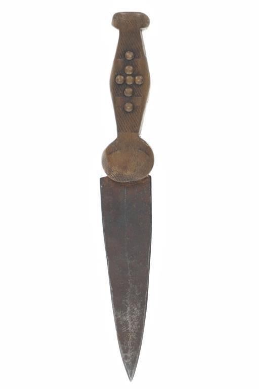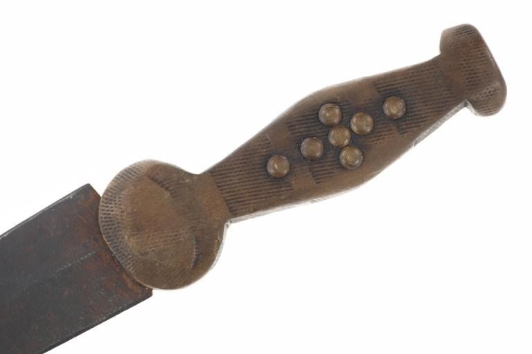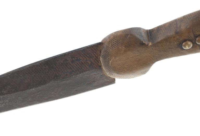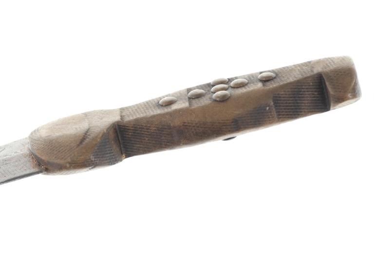The lot features an American dag knife with blade made from a Blacksmith rasp file. The piece is in a beaver tail or beaver back pattern and shows a solid wood one piece handle carved and covered in hot file branding along with brass covered metal tacks. The blade has a dark coloring and it shows a median ridge running down both sides. Measures overall 12.5"L with the blade being 7"L by 1.75"W.