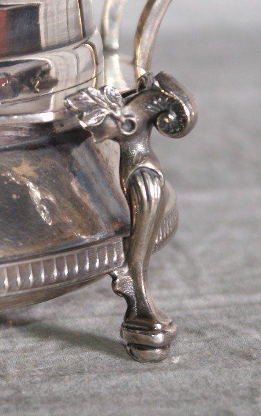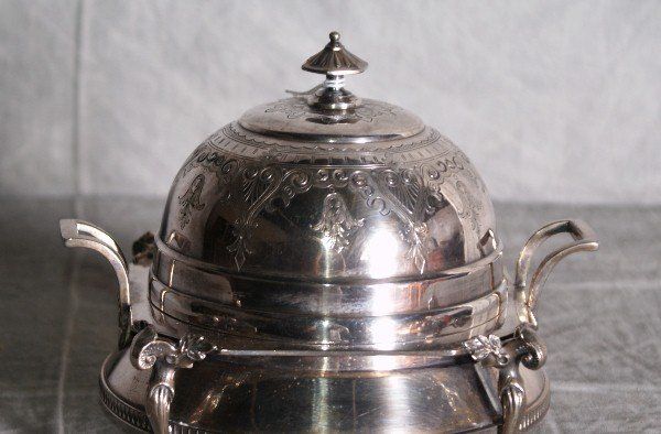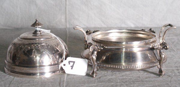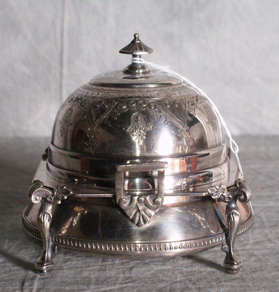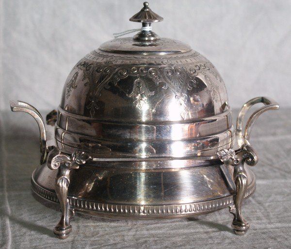 American Redfield Rice silver plate dome covered butter dish raised on figural legs. H:6.5" L:7" .