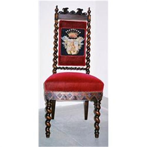 <table width="100%" border="0" cellspacing="0" cellpadding="4"><tr><td><em> </em></td></tr><tr> <td width="100%"> Late 19th-century American Renaissance Revival side chair. High carved back with spiral turned sides and lower crossbar. Seat base decorated all around with repeating quatrefoils and mihrab motifs. Front legs are spiral turned; plain rear legs taper and curve back. The seat and back panel are covered in red velvet. The rectangular rear panel displays a crest and shield on a black ground with red binding. The shield features a leaping stag in profile over a wheel atop three mountain peaks.