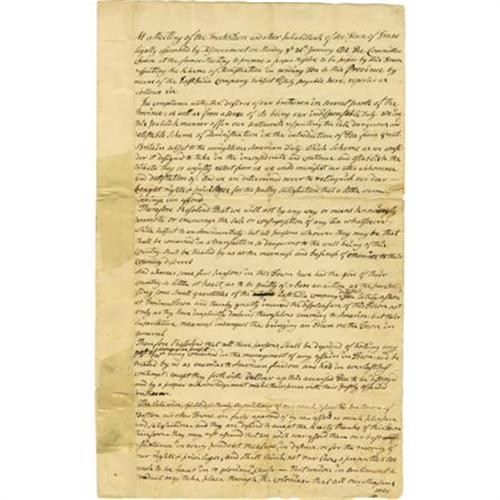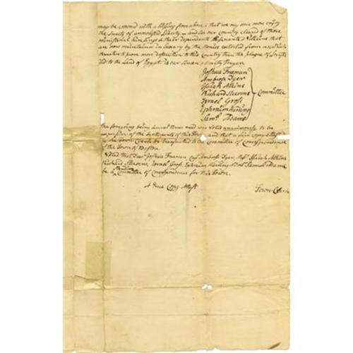 <B>(American Revolution: Boston Tea Party) Important Manuscript Document Signed.</B></I> Two pages, 8"x 13", Truro, Massachusetts, January 24, 1774 addressed on integral address leaf to <I>"The committee of correspondence of Boston"</B></I> to affirm the solidarity of Cape Cod town with Boston and other Massachusetts communities in their opposition to the importation of East India Tea. This company dumped cheap tea upon the American market, effectively undercutting both smuggler and legitimate merchant alike. In addition to this infuriation, the tea was still subject to a tax, considered illegal by the Whigs who were in control of Massachusetts politics. The Boston Tea party on December 16, 1773 enjoyed widespread support in the countryside, including Truro, who resolved: "<I>In compliance with the Desires of our bretheren </B></I> <I>sic</B></I> <I> in Several parts of the Province; as well as from a Sense of it's being our indispensable Duty, We in the publick </B></I> <I>sic</B></I> <I> manner offer our sentiments respecting the late dangerous and detestable scheme of Administration in the introduction of Tea from Great Britain subject to the unrighteous American Duty: Which Scheme as we consider it designed to take in the inconsiderate and continue and establish the tribute they so unjustly extort from us we would manifest our utter abhorrence and detestation...And we are determined never to relinquish</B></I> <I>sic</B></I> <I> our dear-bought rights & privileges for the paltry satisfaction that a little warm sipping can afford. Therefore resolved That we will not by any way or means knowingly promote or encourage the sale of consumption of any Tea whatsoever while subject to an American Duty: but all persons whoever they may be that shall be concerned in a transaction so dangerous to the well being of this Country: shall be treated by us as the meanness and baseness of enemies to their country deserves...The late wise spirited & manly resolutions of our much respected bretheren</B></I> <I>sic</B></I> <I> of Boston, and other Towns, are fully approved of by us--afford us much pleasure and satisfaction--and they are desired to accept the hearty thanks of this Town therefore. They may rest assured that we will ever afford them our best assistance in every prudent measure, in defence</B></I> <I>sic</B></I> <I>, or for the recovery of our rights & privileges and shall think not our lives & properties too much to be spent in so glorious a cause.</B></I>" The demonstration in Boston galvanized the countryside into action, violators of the boycott were harassed, "warned out" of town, and occasionally tarred and feathered. One such troublemaker was John Greenough, a Wellfleet schoolmaster, who collaborated with an associate to recover two chests of the East India tea from a wreck off Provincetown. The wrecked ship, the <I>William,</B></I> was one of four ships laden with tea that sailed for Boston -- the other three continued on towards Boston where they were attacked and their contents thrown overboard by the Sons of Liberty on the night of December 16, 1773. Greenough and his partner made an imprudent attempt to sell the tea from the wrecked boat. This attempt was greeted by a rather negative response. After the town's pledge of solidarity with Boston, the inhabitants singled out "<I>some few persons in this Town have had the good of their country so little at heart, as to be guilty of so base an action as the purchasing some small quantities of the East India Company's detested Tea lately ashore at Province Town and thereby greatly incurred the displeasure of this Town not only as they have implicitly declared themselves enemies to America: but their superlative meanness endangers the bringing an odium on this Town in general...and be treated by us and enemies to American freedom and held in everlasting contempt...</B></I>" This piece abounds with fine content and is truly remarkable piece that documents the popular reaction to the Boston Tea Party and the manner in which political opponents were regarded in this increasingly volatile political environment erupted into open warfare fifteen months later. Weak at folds (some repaired) with partial separation, light foxing, else very good. <I>Ex. Henry E. Luhrs Collection</B></I><BR><BR><b>Shipping:</b> Flat Material, Small (<a target="_blank" href="http://www.heritageauctions.com/common/shipping.php">view shipping information</a>)