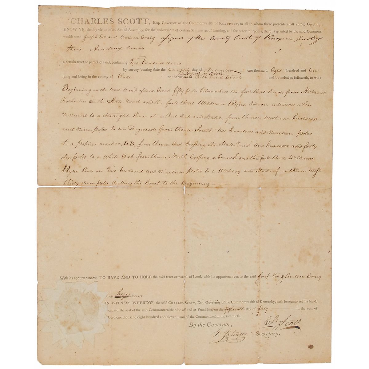 Revolutionary War officer (1739–1813) who served as Washington’s chief of intelligence. He later served as the fourth governor of Kentucky. Partly-printed DS, signed “Chs. Scott,” one page, 12.5 x 15, July 15, 1811. Governor Scott grants 200 acres of land in Knox County to Joseph Eve and Andrew Craig. Signed at the conclusion by Scott. Intersecting folds, partial separation along central horizontal fold, mounting remnants to reverse, and scattered toning and dampstaining, otherwise very good condition.