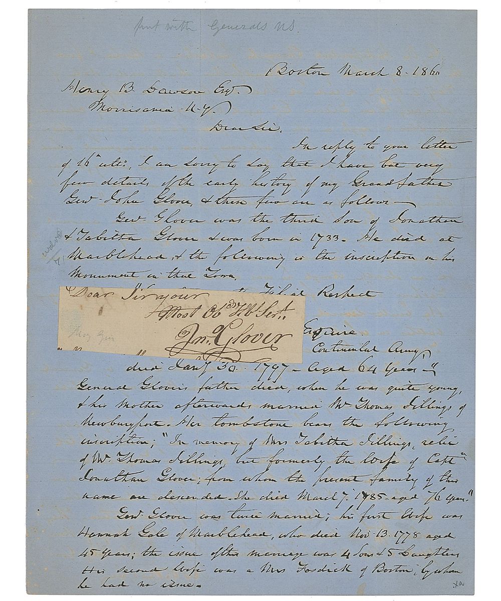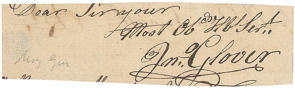 Brigadier General (1732–1797) who served in the Continental Army during the American Revolution. Glover’s regiment ferried Washington and his armies across the Delaware for the surprise attack on Trenton in 1776. Ink signature, “Dear Sir your Most Obdt. Sert., Jno. Glover,” on an off-white 4 x 1 slip clipped from the closing of a letter. Slip is affixed by its left edge to a two-page 1860 letter from Glover’s grandson Robert Hooper. Hooper writes, in part: “The complimentary letter written to him by General Washington on his retirement from the Army is still in possession of the family. I send you his autograph. The family have no portrait of him; but there is one at the Capitol in Washington; painted, I believe, by Trumbull.” In fine condition, with a bit of light show-through from writing on reverse of slip, and some scattered toning and pencil notations to letter.