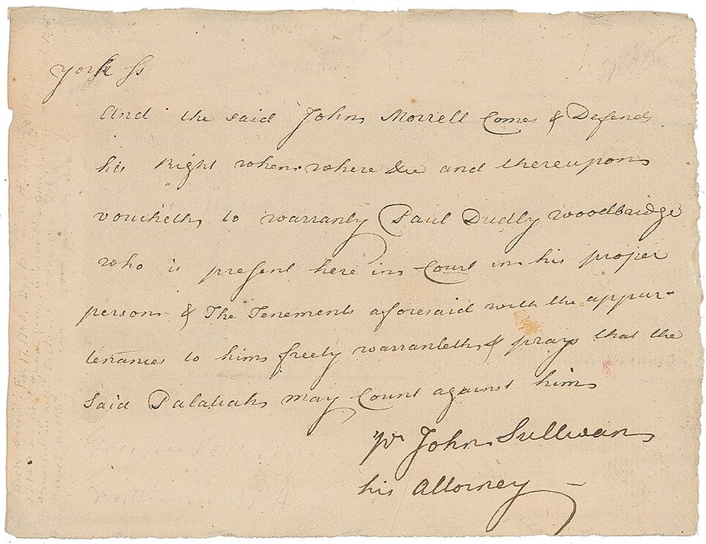 Major General in the American Revolutionary War (1740–1795) and governor of New Hampshire. Manuscript DS, signed “Yr John Sullivan, his attorney,” one page, 6.5 x 5, no date. Final portion of a longer legal document, “John Morrell comes & defends his rights” against Paul Dudley Woodbridge. In fine condition, with intersecting folds and small mounting remnants along top edge of reverse.