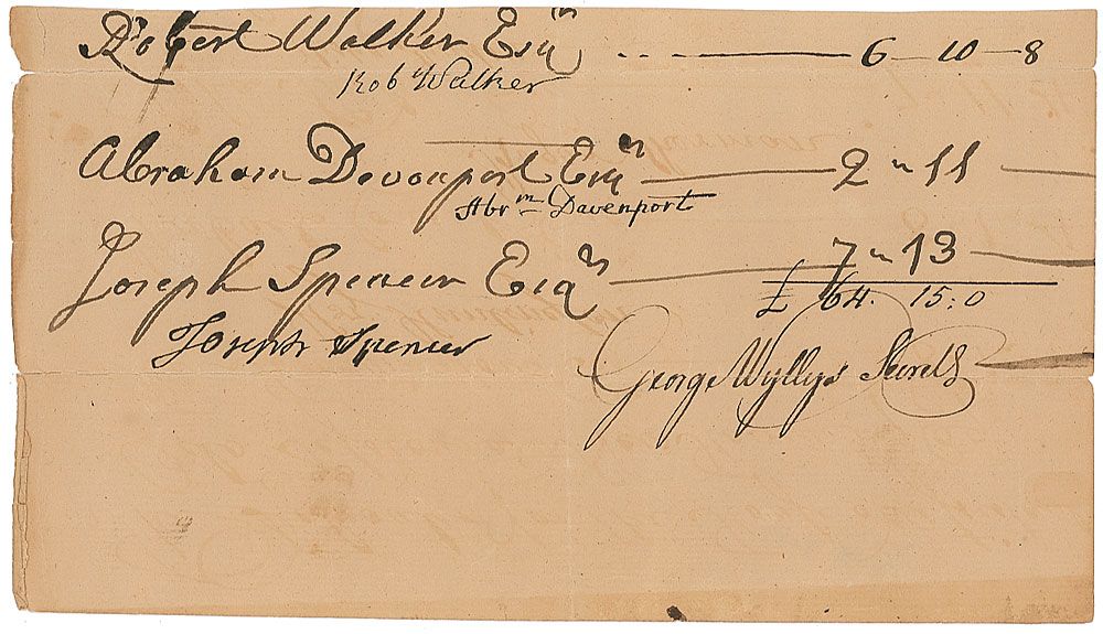 Soldier and statesman (1714–1789) who served as a delegate to the Continental Congress and as a major general in the Continental Army. Manuscript DS, one page, 8 x 4.5, no date. Partial document listing cash amounts for three notable individuals, each signing beneath his name: Joseph Spencer, Abraham Davenport, and George Wyllys. All three men served key roles in Connecticut politics, before, during, and after the revolution. Partial separations along intersecting folds, some light mirroring of ink, and a uniform shade of mild toning, otherwise fine condition.