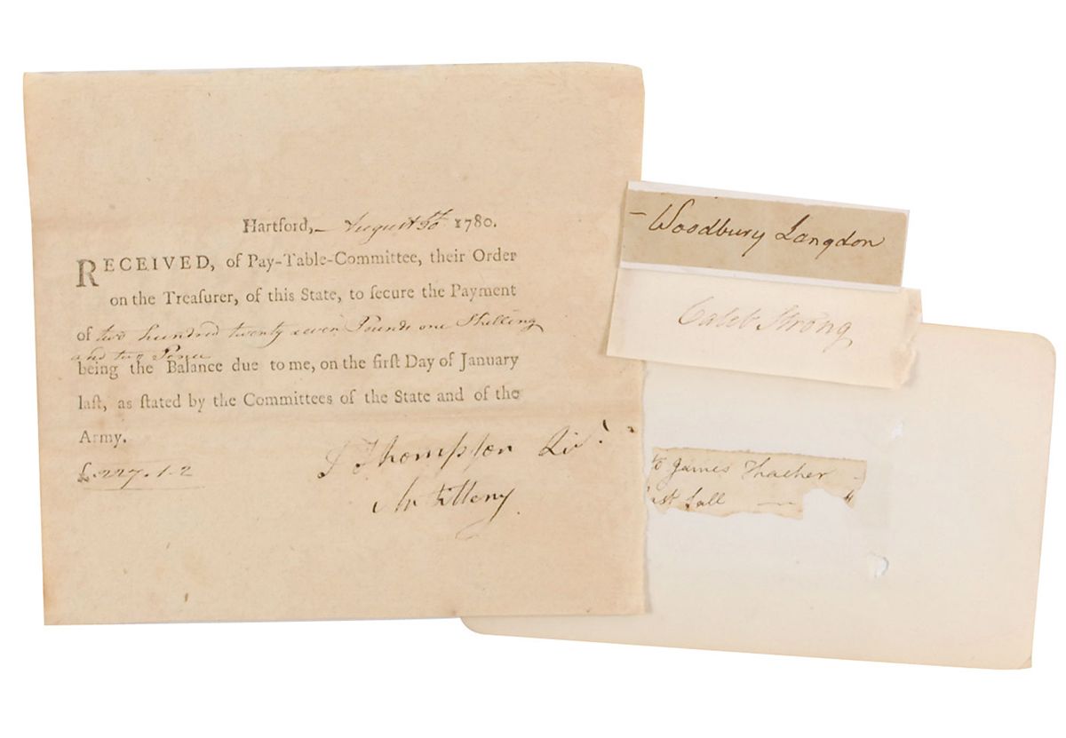 Collection of four items, each signed by a different early American patriot. Signers are: Caleb Strong (sig), Woodbury Langdon (sig), James Thacher (signature), and Isiah Thompson (DS). In overall fine condition.