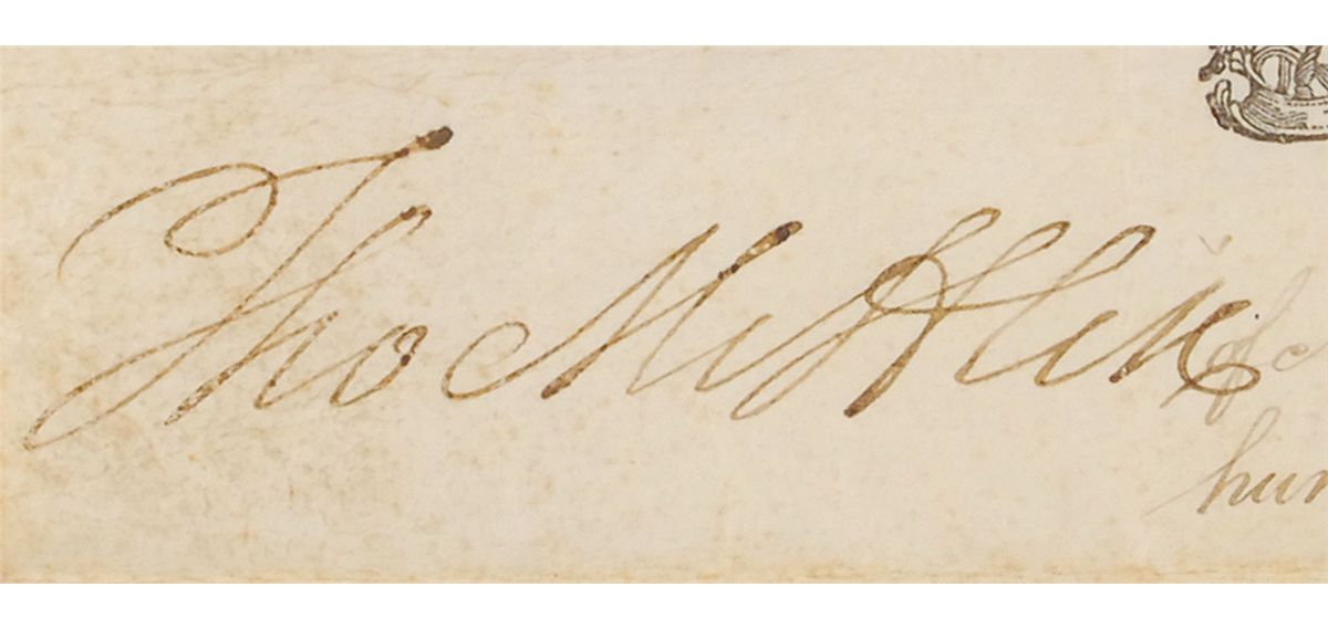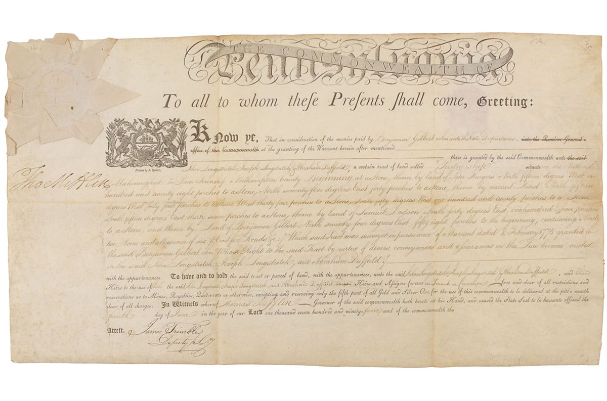 Signer of the US Constitution from Pennsylvania (1744–1800), first governor of that state, and President of the Continental Congress. Partly-printed DS, signed “Tho Mifflin,” one page, 21 x 11.5, June 4, 1794. Governor Mifflin grants a tract of land called “Partnership” to three men, signed under the eight-point seal by Mifflin. In very good to fine condition, with intersecting folds, a couple small pencil notations to top and bottom edge, and a bit of scattered light toning. The large paper seal is toned and creased, but intact.