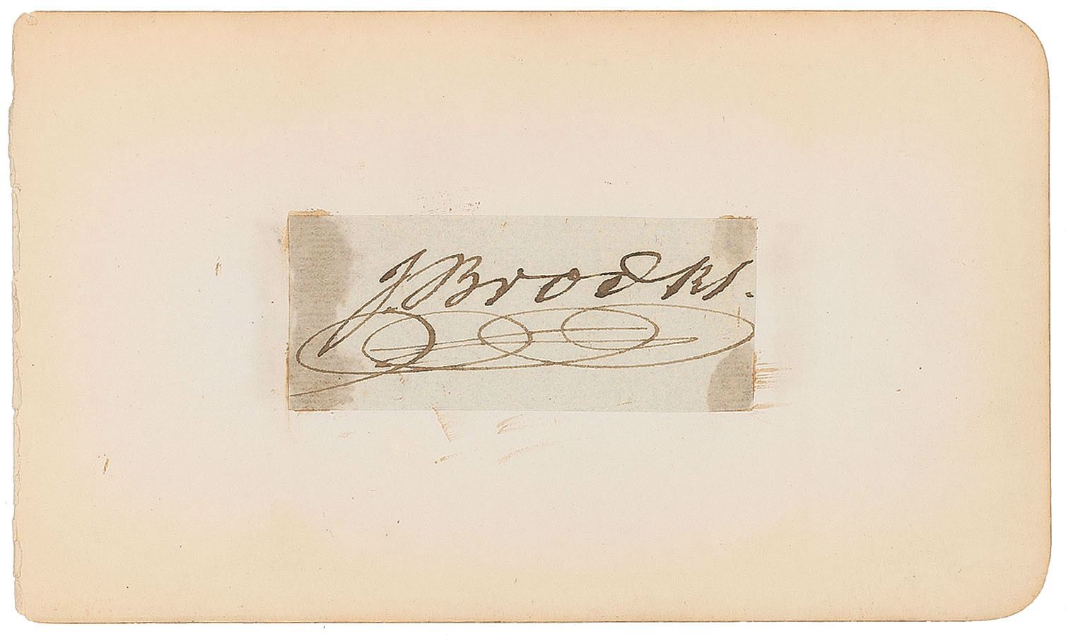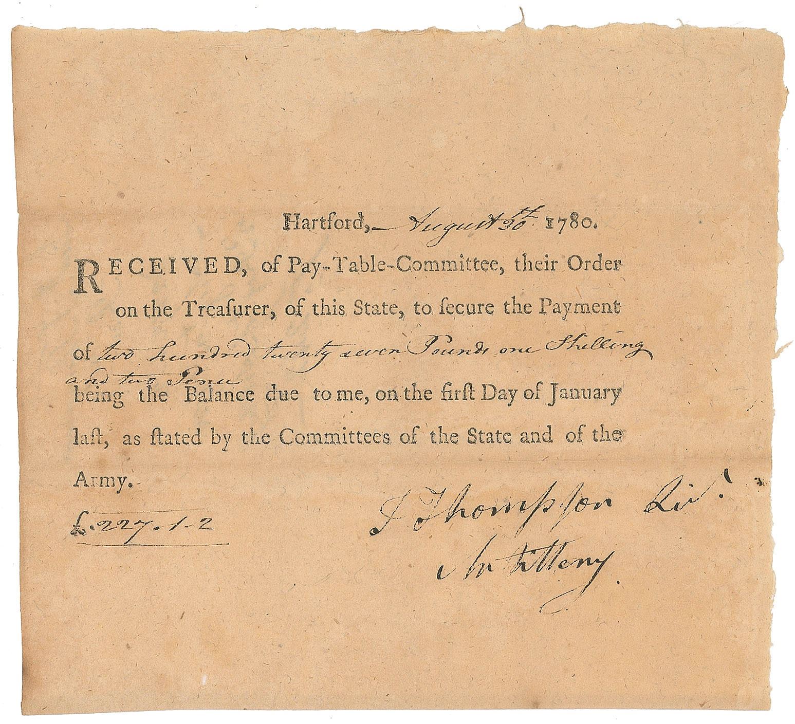 Three items signed by an officer from the American Revolution: an ink signature of John Brooks, the 11th Governor of Massachusetts and an officer of the Reading, Massachusetts militia when the American Revolutionary War broke out, who led his troops in the Battles of Lexington and Concord; an ADS signed by Adam Stevens, a lieutenant colonel in the Virginia regiment under George Washington, dated December 17, 1764, regarding a pay order issued to Neil Jameson for £80, countersigned by Cornelius Calvert; and a partly-printed DS, signed by Isaiah Thompson, a first lieutenant in the artillery regiment of Colonel John Lamb, dated August 30, 1780, regarding a receipt from the Connecticut Pay-Table. In overall very good to fine condition, with some staining to Brooks. The Stevens document is affixed to a slightly larger sheet.
