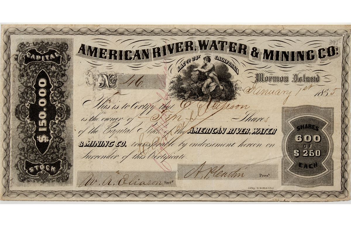 No. 46. Issued on January 1st, 1855. Issued to E. Rilison for ten shares. Signed by president and secretary. Pen cancelled. Vignette of Mercury figure. Lith. Britton & Rey. Mormon Island was located on the South Fork of the American River, three miles from the junction with the North Fork. It was actually a sand bar, not an island. According to Gudde, it was the first regular gold camp after the discovery at Sutter's Mill.Two Mormons discovered gold at the spot on March 2, 1848. Gudde argues that the findings at this place actually started the Gold Rush. It is now under Folsom Lake. (Prag Collection)