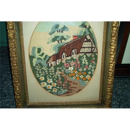 <table width="100%" border="0" cellspacing="0" cellpadding="4"><tr><td><em> VERY LOW REDUCED RESERVE!! REDUCING INVENTORY. </em></td></tr><tr> <td width="100%"> Today you will have the pleasure of bidding on this wonderful, colorful, sampler. Scene displays a beautiful, country house in colors of brown, tan, and a cream color. The lovely sky displays a very light color of blue along with some creamed color blended in to make a wonderful skyline. Lovely forest green grass covered with all shapes and sizes of brightly colored flowers. The walkway to the front of the house is in the color of grey. The frame is a beautiful gold framed, with the inside of the gold frame trimmed in army green paint. This framed sampler measures 19 1/2 inches tall by 15 3/4 inches wide. The back of the frame appears professional finished. Some writing on the back of who made the sampler, but most of the words has been marked out with a black marker. My eyes can only make out the words: Handwork done by Barb Weldon. Someone with good eyes would be able to make out the rest. It was made by Barb Weldon and given to someone, etc. I think that it even tells who did the framework. Original wire and hooks are still attached. The picure of the back of the frame shows the wire and it appears to look as though the bottom half is stained, but, it is not. An excellent, vintaged framed, sampler. </td></tr><tr> <td> </td></tr><tr> <td>Reference #: 623B</td></tr><tr><td>Condition:Excellent</td></tr><tr><td>Year:Early 20th Century</td></tr><tr><td>Country:USA</td></tr><tr><td>Title:American Sampler </td></tr><tr><td>Location:Letart, West Virginia</td></tr></table>