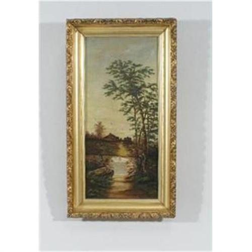 American School, 19thc., Landscape - Oil on canvas, depicting a view towards a homestead from across the river. Unsigned. Period, probably gilt composition frame. Beautiful. Art size - 17"h x 7.75"w; Dimensions overall 20.25"h x 10.75"w.