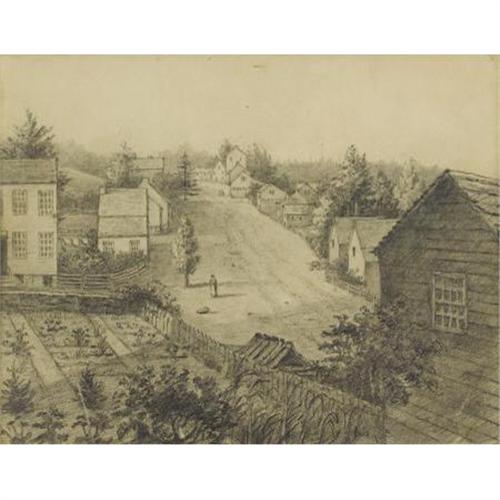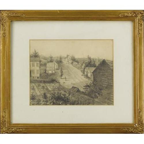 <B>AMERICAN SCHOOL (19th Century)</B></I><BR><I>Country Lane</B></I><BR>Graphite on paper<BR>6-1/4 x 8 inches (15.9 x 20.3 cm)<BR> <B>Condition Report:</B> Toning; crease to lower left, approximately 1-1/2 inch long.<BR><BR><b>Shipping:</b> Framed - without Glass, Small (<a target="_blank" href="http://www.heritageauctions.com/common/shipping.php">view shipping information</a>)