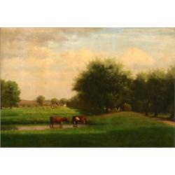 American School, Mid-19th Century, Rural Landscape with Cows Watering, Unsigned, Oil on can...
