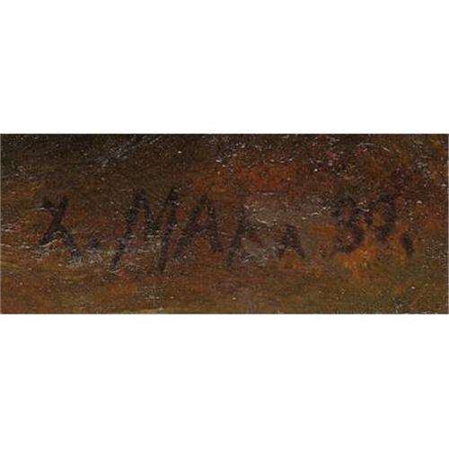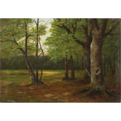 <B>AMERICAN SCHOOL (20th Century)</B></I><BR><I>Forest Landscape</B></I><BR>Oil on card board<BR>9 x 12-3/4 inches (22.9 x 32.4 cm)<BR>Signed lower right: <I>X. MARX 30?</B></I><BR> <B>Condition Report:</B> Normal signs of wear as appropriate with age.<BR><BR><b>Shipping:</b> Flat Material, Small (<a target="_blank" href="http://www.heritageauctions.com/common/shipping.php">view shipping information</a>)