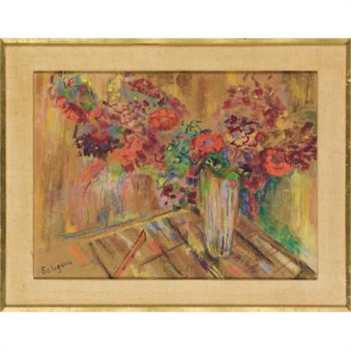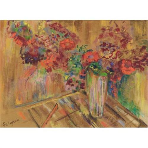 <B>AMERICAN SCHOOL (20th Century)</B></I><BR><I>Still Life with Flowers</B></I><BR>Oil on paper laid on masonite<BR>20-1/4 x 26-3/4 inches (51.4 x 67.9 cm)<BR>Signed lower left: <I>Seligson</B></I><BR>