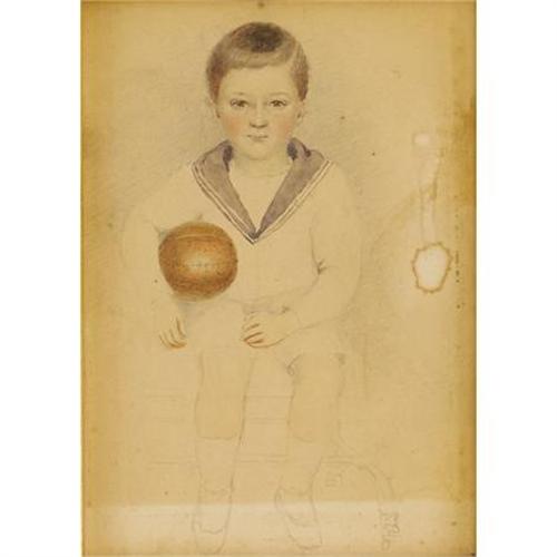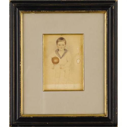 <B>AMERICAN SCHOOL (Early 20th Century)</B></I><BR><I>Unfinished Portrait of a Young Boy</B></I><BR>Watercolor and graphite on paper<BR>5-1/2 x 4 inches (14.0 x 10.2 cm)<BR> <B>Condition Report:</B> Heavy toning; foxing throughout; water damage to right edge, extending approximately 1-1/2 inch.<BR><BR><b>Shipping:</b> Framed - without Glass, Small (<a target="_blank" href="http://www.heritageauctions.com/common/shipping.php">view shipping information</a>)