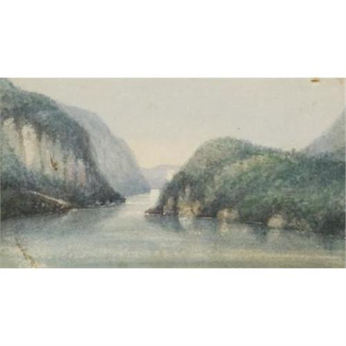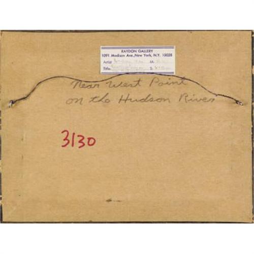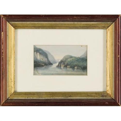 <B>AMERICAN SCHOOL</B></I><BR><I>Near West Point on the Hudson River</B></I><BR>Watercolor on paper<BR>2-3/8 x 4-1/8 inches (6.0 x 10.5 cm)<BR>Inscribed verso: <I>I M/Near West Point/Hudson River</B></I><BR> <BR><BR><b>Shipping:</b> Framed - with Glass, Small (<a target="_blank" href="http://www.heritageauctions.com/common/shipping.php">view shipping information</a>)