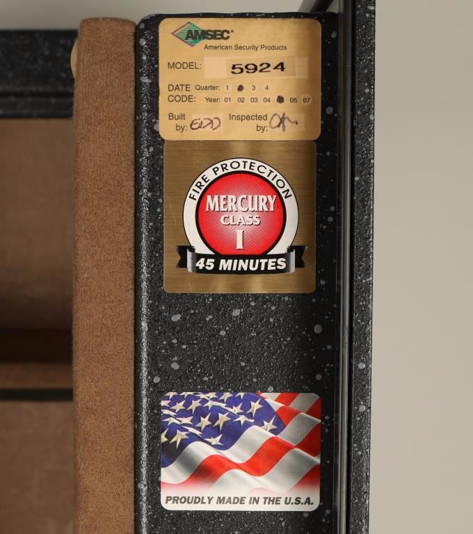 Black and gray marbled paint, combo lock measures 59 1/2"x24"x18" houses 8 long guns and has four interior shelves. Mdl 5924 fire protection rating 45 mins, made in the USA. Combination will be provided.