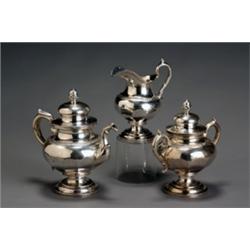 Consisting of a teapot, Mulford & Wendell, Albany, NY, 1843-1850, and a covered sugar urn and cream jug, makers unknown. The teapot engraved with a monogram. Each impressed with maker's mark; the sugar urn and cream jug impressed on the underside with a lion, G and a lady's profile. Repair to handle of cream jug at body; cream jug with split to interior of handle.