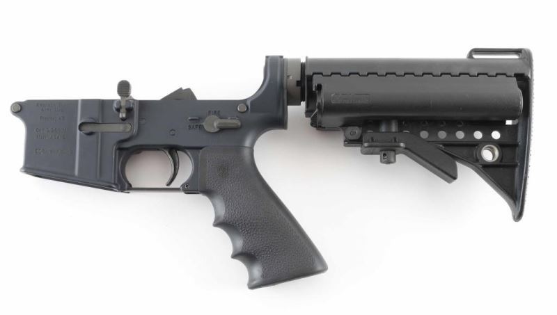 SN: AS10815 Lower receiver assembly accepts AR15 type uppers. Includes all internal parts. Features matte black color on most parts (dark gray parkerizing on some smaller parts), Hogue finger groove pistol grip, VLTOR collapsing stock with storage compartments, socket for QD swivel on butt. Shows few signs of prior use, some scuffs to finish. Condition is NRA Very Good++ *** Modern Firearm ***