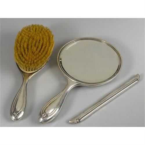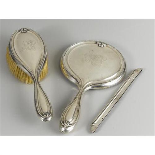 <B>An American Silver Vanity Set<BR></B></I>International Silver Co., Meriden, CT<BR>Late Nineteenth Century<BR><BR>Including a hand mirror, hair brush and comb back, script monogram to the reverse <I>MES</B></I>, hallmark to the top with <I>STERLING C514 </B></I><BR>10 inches long x 5.4 inches wide<BR> <B>Condition Report:</B> Normal signs of wear as appropriate with age; very slight dents to the reverse of the mirror and to the comb back.<BR><BR><b>Shipping:</b> Miscellaneous Collectibles, Larg (<a target="_blank" href="http://www.heritageauctions.com/common/shipping.php">view shipping information</a>)