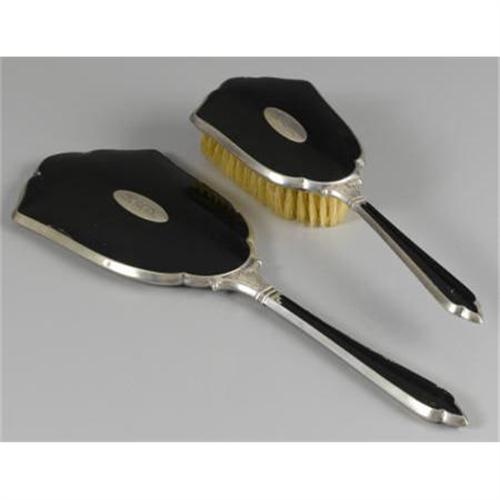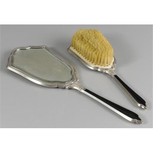 <B>An American Silver and Enamel Hand Mirror and Brush<BR></B></I>Maker unknown<BR>Early Twentieth Century<BR><BR>Monogram to the reverse <I>MAR</B></I>, marked on the handle <I>STERLING</B></I> <BR>The mirror: 12.2 inches long x 4.2 inches wide<BR> <B>Condition Report:</B> Normal signs of wear as appropriate with age; some delamination to the reverse of the mirror.<BR><BR><b>Shipping:</b> Miscellaneous Collectibles, Larg (<a target="_blank" href="http://www.heritageauctions.com/common/shipping.php">view shipping information</a>)