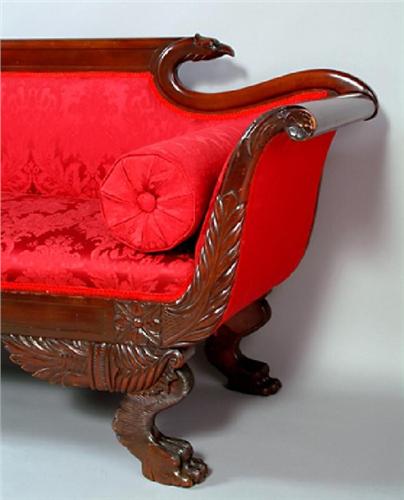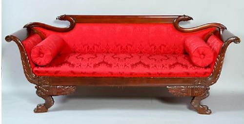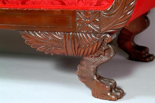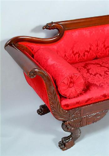 (19th Century American, c.1880) Classical mahogany sofa with crest rail and phoenix head carving, acanthus leaf carving, red damask upholstered, pair of bolster pillows, very good condition, 38" by 81" by 28".