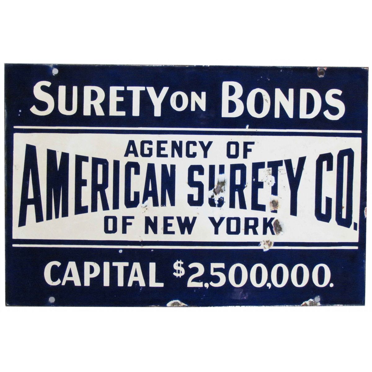 American Surety Co. Porcelain Sign. Several paint chips otherwise good condition. 15 X 10 inches.