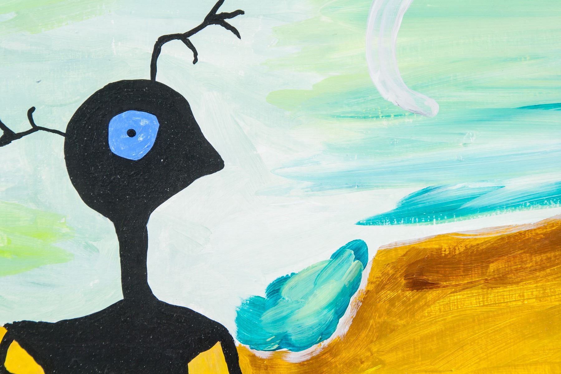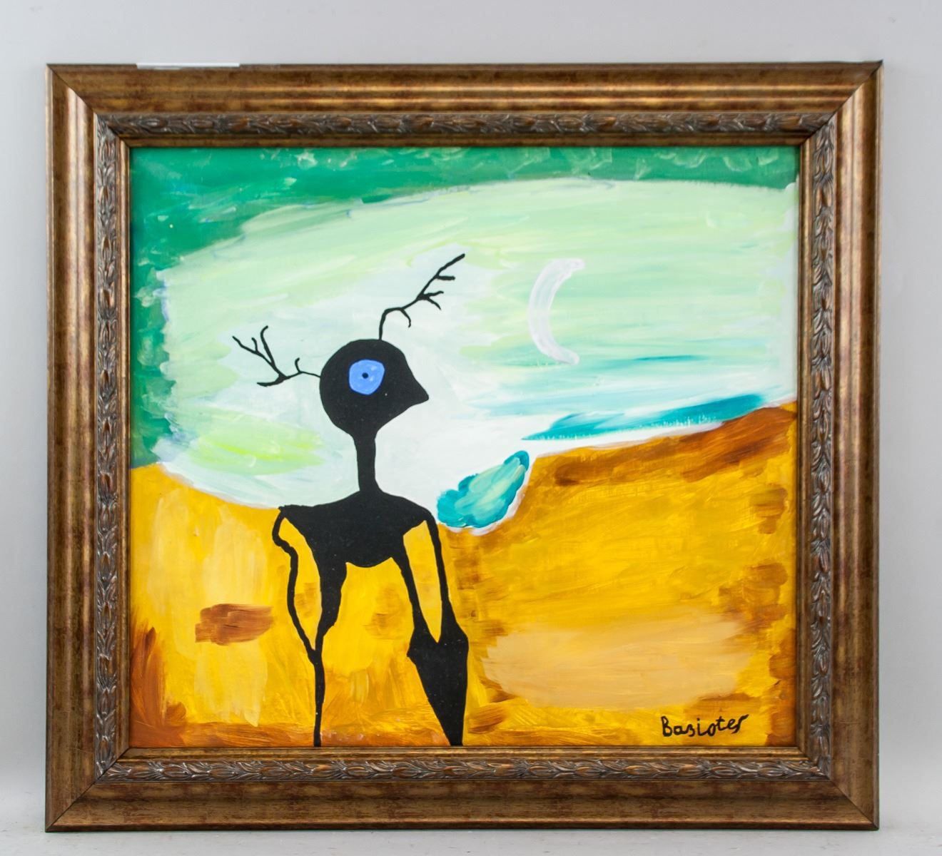Oil on canvas, framed. Featuring a landscape scene with an surrealist animal. Signed illegibly on the lower right corner. 40.5 x 45 cm (15.9 x 17.7 inches), framed size: 51 x 55.5 cm (20.1 x 21.9 inches)