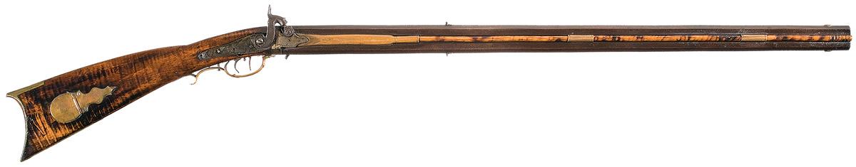 The only visible marking on the rifle is a "CH" on a top barrel flat and "S. DRASHER" stamped three times on the belly of the stock. The rifled barrel gauges at 46 caliber and the smooth bore at 42. Fixed sights on each barrel, ramrod on each side, drum style bolsters, brass left side plate, brass trigger guard/barrel release, adjustable double set triggers and mounted with a maple stock with a brass accent and crescent moon on the cheekpiece, brass patch box and crescent buttplate with 5 1/2" toe extension.