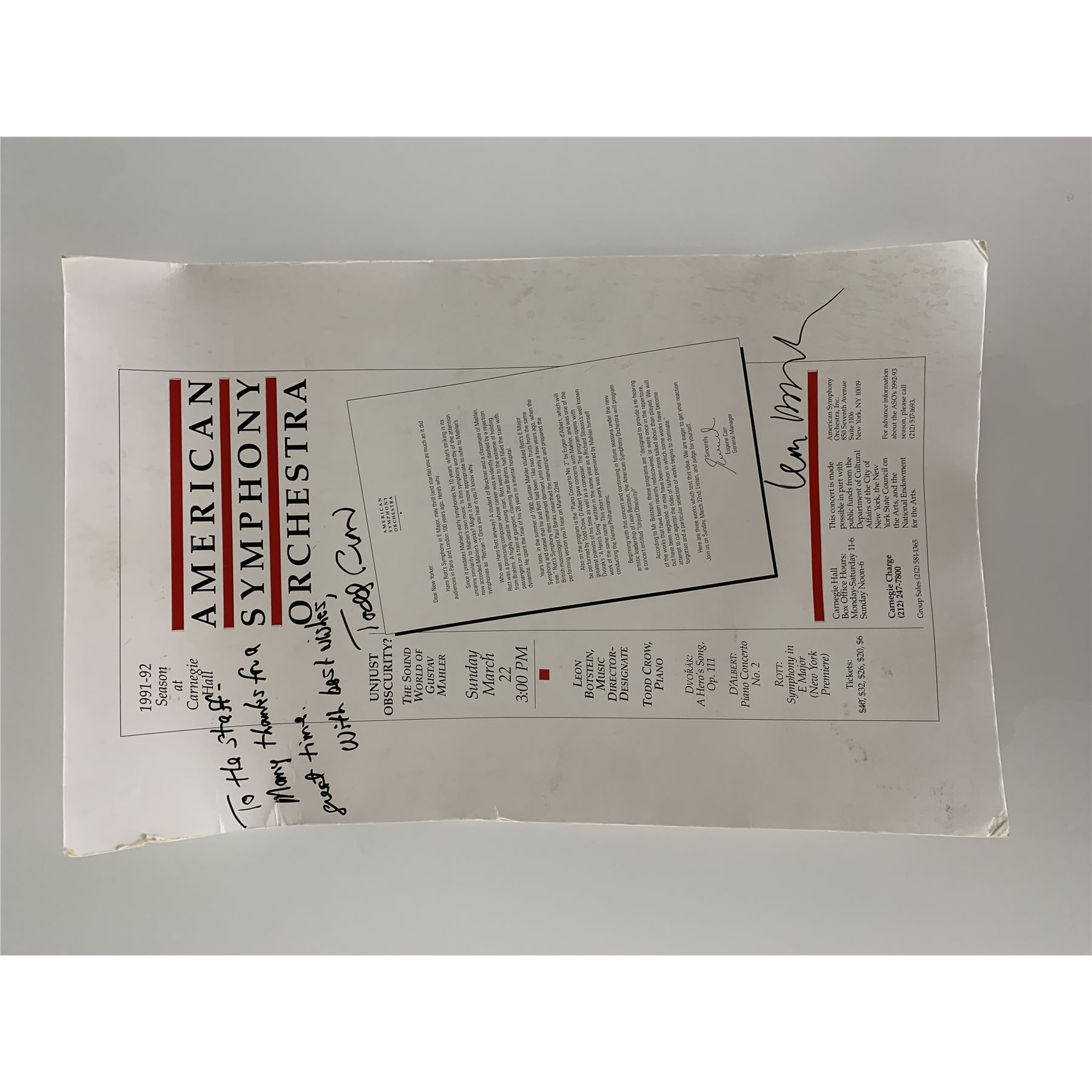 American Symphony Orchestra promo poster signed by Todd Crow and Leon Botstein. 14x22 inches